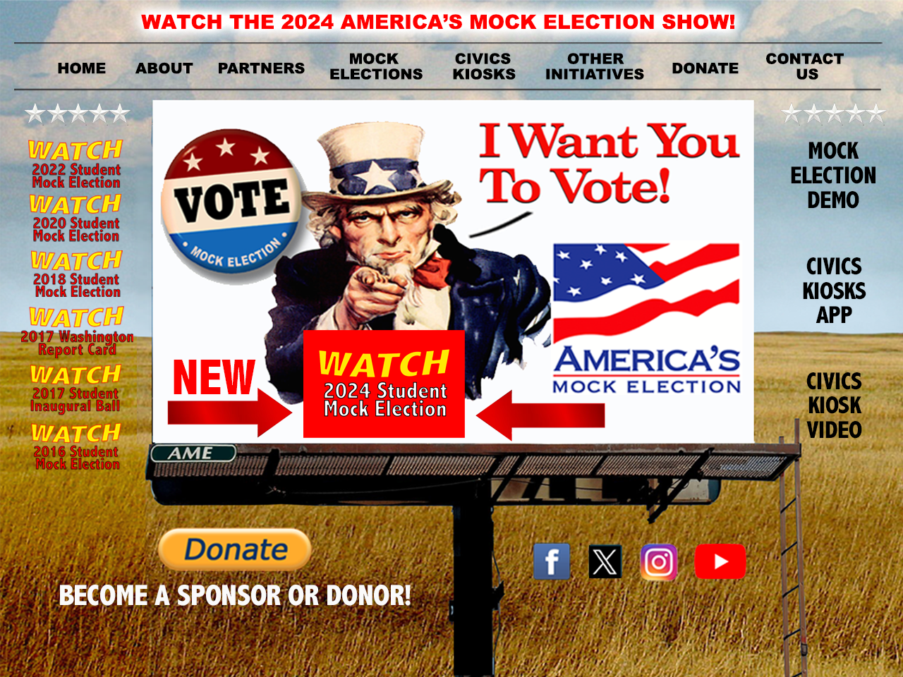 Watch the 2024 SPECIAL American Mock Election About AME Partners Mock Elections Civics Kiosks Other Initiatives Donate Contact Us AME 2022 Mock Election AME 2020 Mock Election AME 2018 Mock Election AME 2017 Washington Report Card AME 2017 Student Inaugural Ball AME 2016 Mock Election Watch the 2024 SPECIAL Please Donate Join us on Facebook follow us on Twitter Visit Us On Instagram View Our YouTube Channel AME Mock Election Demo ACE Civic Kiosk App AME Civic Kiosk Demo